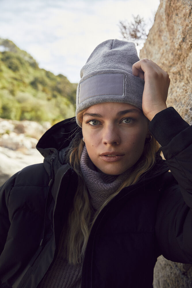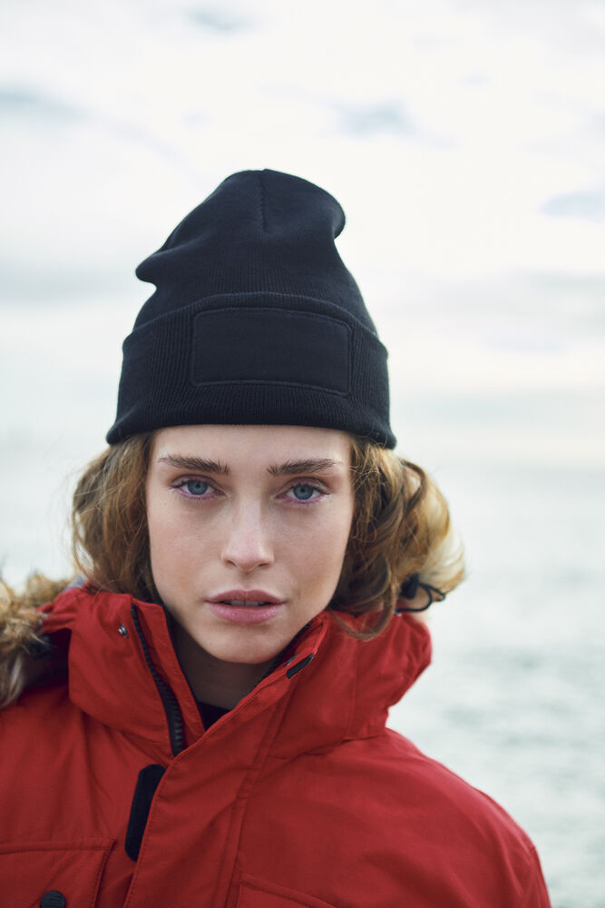 Stickad mössa med uppvik. Fastsydd platta för den perfekta märkningen (mått 9,5x4,5 cm).